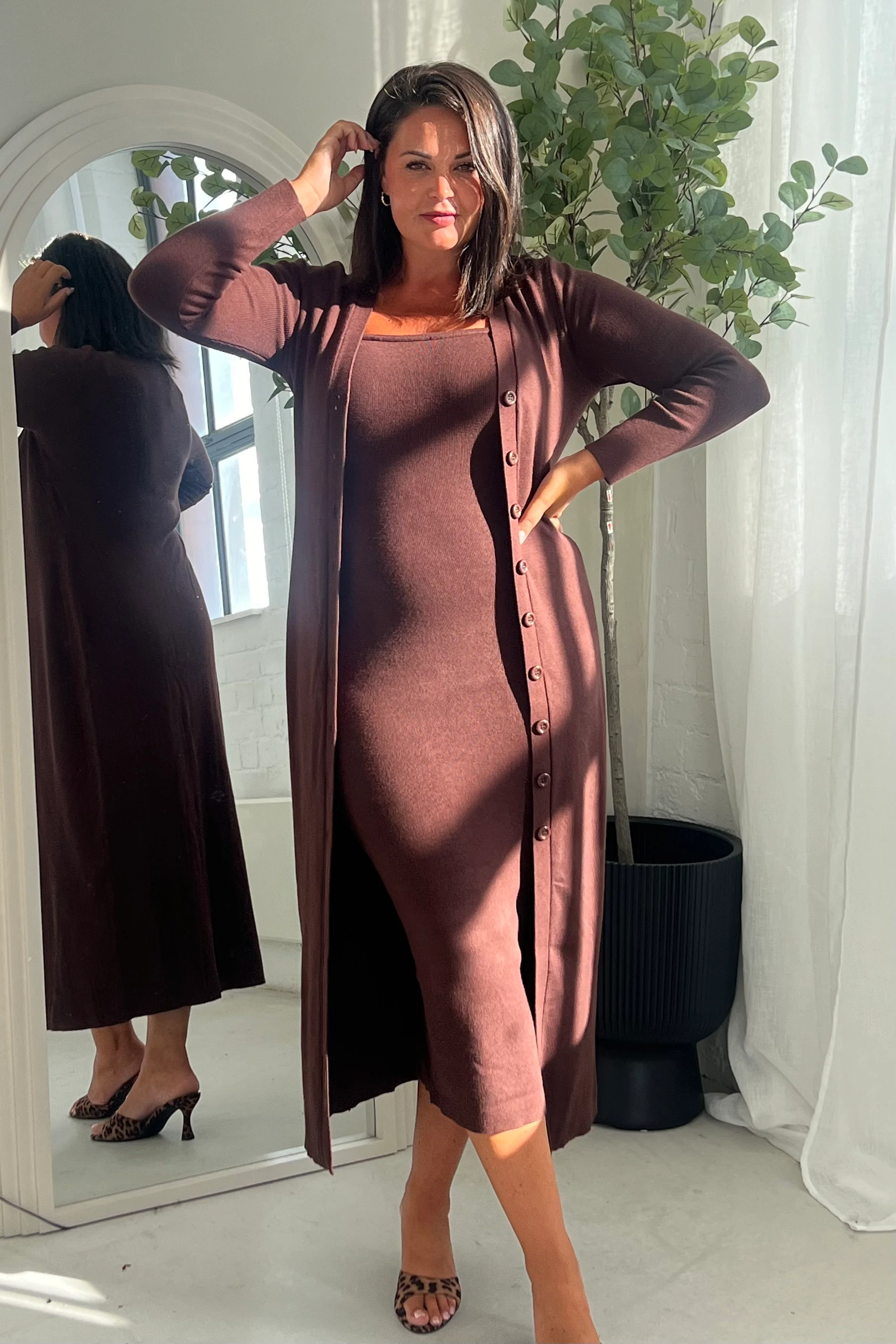 Wrap up in luxury with our Alina Longline Cardigan Dress. Crafted from a soft knit, this cardigan is perfect for cosy days. The timeless elegance of this piece makes it a must-have wardrobe staple! Wear as a Cardigan with a matching dress and trainers or on its own as a dress.