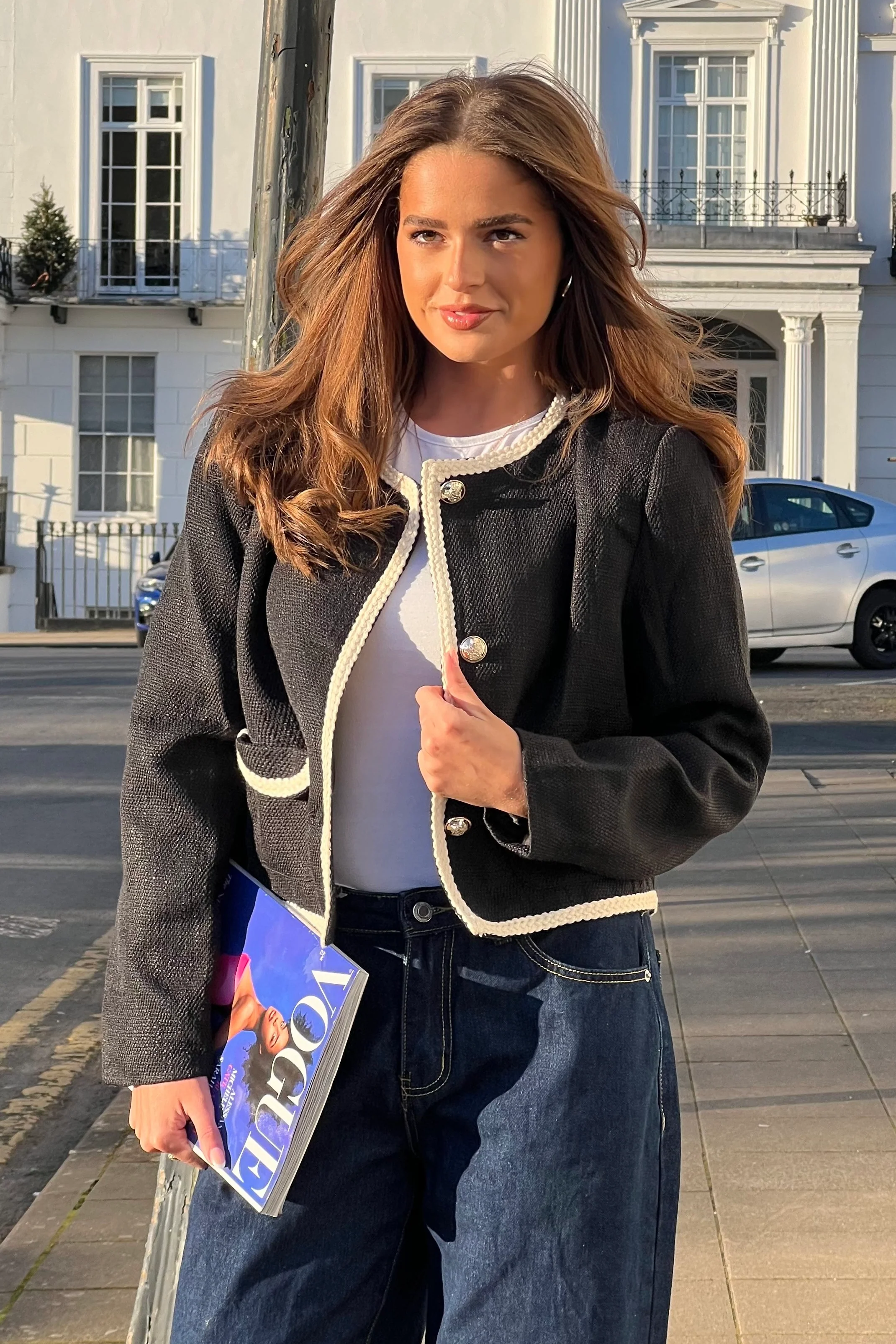 Indulge in sophistication and elegance with our Coco Tweed Blazer. With its boxy cropped fit this blazer exudes luxury and exclusivity. The black tweed with white trim adds a touch of timeless style, making it a perfect addition to your wardrobe.